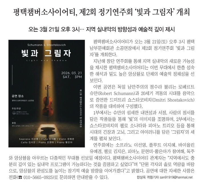 ÆòÅÃè¹ö¼Ò»çÀÌ¾îÆ¼°¡ ¿À´Â 3¿ù 21ÀÏ(Åä) ¿ÀÈÄ 3½Ã ÆòÅó²ºÎ¹®¿¹È¸°ü ¼Ò°ø¿¬Àå¿¡¼ Á¦2ȸ Á¤±â¿¬ÁÖȸ ¡®ºû°ú ±×¸²ÀÚ¡¯¸¦ °³ÃÖÇÑ´Ù.