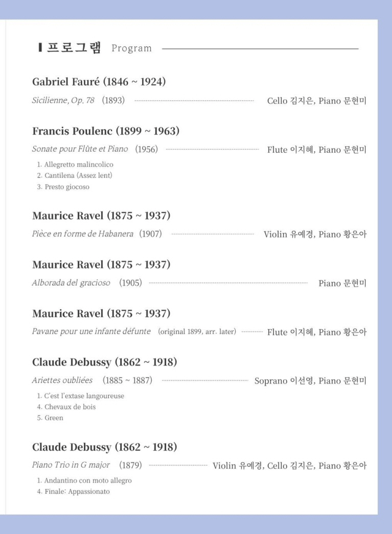¿¬ÁÖȸ´Â Æ÷·¹¿¡¼ Ç®¶ûÅ©, ¶óº§, µåºß½Ã¿¡ À̸£´Â ÇÁ¶û½º ³¶¸¸¡¤±Ù´ë À½¾ÇÀÇ È帧À» µû¶ó ±¸¼ºµÈ´Ù. Æ÷·¹ÀÇ ¡®½ÃÄ¥¸®¾È´À¡¯°¡ º¸¿©ÁÖ´Â ÀºÀºÇÑ ¼Á¤¼º¿¡¼ ½ÃÀÛÇØ, Ç®¶ûÅ© ƯÀ¯ÀÇ Çö´ëÀûÀ̰í À¯¸Ó·¯½ºÇÑ ¸Å·ÂÀ» ´ãÀº ¡®ÇÃ·çÆ® ¼Ò³ªÅ¸¡¯°¡ À̾îÁö¸ç, ¶óº§ÀÇ Á¤¹ÐÇÏ°í ¼¼·ÃµÈ À½¾Ç ¼¼°è ¶ÇÇÑ ¹«´ë¿¡¼ ¸¸³¯ ¼ö ÀÖ´Ù. ÈĹݺο¡´Â ÀλóÁÖÀÇ À½¾ÇÀÇ ´ëÇ¥Àû ÀÛ°î°¡ µåºß½ÃÀÇ ÀÛǰµéÀÌ ÆîÃÄÁø´Ù. µåºß½Ã ÃʱâÀÇ °¨¼º°ú »öä°¡ ´ã±ä ¡®Ariettes oubliées¡¯¿Í 18¼¼ ÀÛ°î ´ç½ÃÀÇ ÀþÀº ¿¡³ÊÁö°¡ »ì¾Æ ÀÖ´Â ÇÇ¾Æ³ë Æ®¸®¿À°¡ °ü°´µé¿¡°Ô ±íÀº ÀλóÀ» ³²±æ °ÍÀ¸·Î ±â´ëµÈ´Ù.