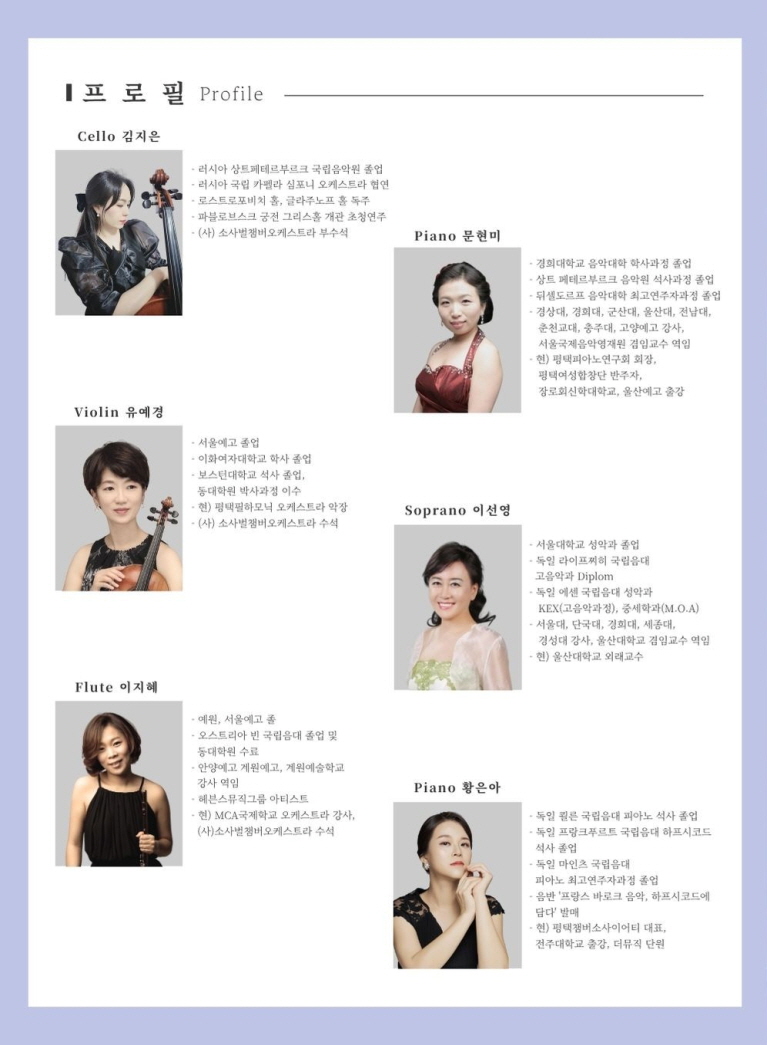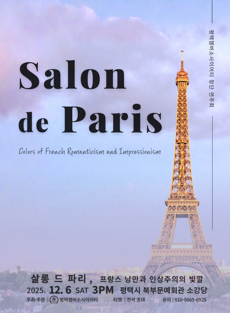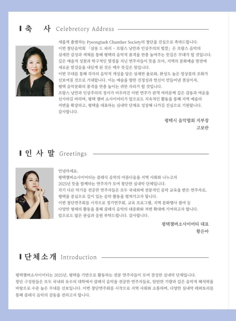 »õ·Ó°Ô Ãâ¹üÇÏ´Â ÆòÅÃè¹ö¼Ò»çÀÌ¾îÆ¼(Pyeongtaek Chamber Society)°¡ ¿À´Â 12¿ù 6ÀÏ(Åä) ¿ÀÈÄ 3½Ã, ÆòÅà ºÏºÎ¹®È¿¹¼úȸ°ü ¼Ò°´ç¿¡¼ â´Ü¿¬ÁÖȸ¸¦ ¿¬´Ù. À̹ø À½¾Çȸ´Â ¡¸»ì·Õ µå ÆÄ¸® – ÇÁ¶û½º ³¶¸¸°ú ÀλóÁÖÀÇÀÇ ºû±ò¡¹À̶ó´Â Á¦¸ñÀ¸·Î, ÇÁ¶û½º À½¾Ç ƯÀ¯ÀÇ ¼¶¼¼ÇÑ °¨¼º°ú »ö並 Àü´ÞÇÏ´Â ÇÁ·Î±×·¥À¸·Î ±¸¼ºµÆ´Ù.