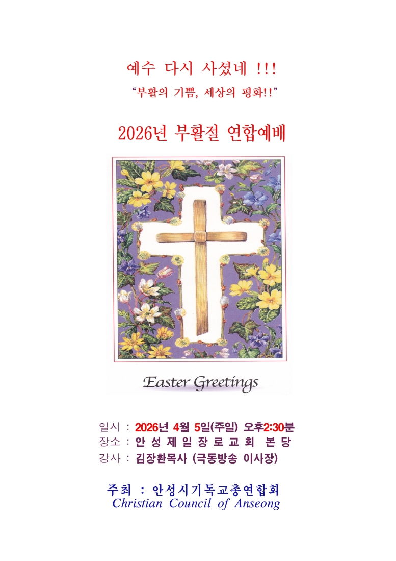 °æ±âµµ ¾È¼º½Ã ±âµ¶±³ÃÑ¿¬ÇÕȸ(ȸÀå ¾ç¿µÈ£ ¸ñ»ç)´Â 2026³â4¿ù5ÀÏ(ÁÖÀÏ)¿ÀÈÄ2½Ã30ºÐ ¾È¼ºÁ¦ÀÏÀå·Î±³È¸(¾ç½Å ´ãÀÓ¸ñ»ç)¿¡¼ ±Øµ¿¹æ¼Û ÀÌ»çÀå ±èÀåȯ ¸ñ»ç¸¦ °»ç·Î ºÎȰÀý ¿¬ÇÕ¿¹¹è¸¦ °®´Â´Ù°í ¹àÇû´Ù.