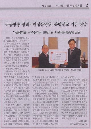 ÆòÅ᤾ȼº µðÁöÅб⵶±³¹®È¼±±³ÇùÀÇȸ(ÀÌ»çÀå: ÀÌÃá¼ö ¸ñ»ç)¿Í ±Øµ¿¹æ¼Û ÆòÅ᤾ȼº¿î¿µÀ§¿øÈ¸(À§¿øÀå ÇÑ»ó¿Á¾È¼öÁý»ç)´Â Áö³ 11¿ù 12ÀÏ(¸ñ) Àú³á 7½Ã 30ºÐ ÆòÅôëÇб³90ÁÖ³â±â³ä°ü¿¡¼ ¼¿ï±Øµ¿¹æ¼Û°ú ÇÔ²² ÁøÇàµÈ ¾È¾ç½Ã¸³ÇÕâ´Ü ÃÊû °¡À»À½¾Çȸ¿¡¼ ¸ð±ÝµÈ °ø¿¬ ¼öÀÍ±Ý 1õ¸¸ ¿øÀ» ±Øµ¿¹æ¼Û »çÀå ÇÑ±âºØÀå·Î¿¡°Ô Àü´ÞÇÏ°í ºÏ¹æ¼±±³¿¡ »ç¿ëÇØ ´Þ¶ó°í ´çºÎÇß´Ù.